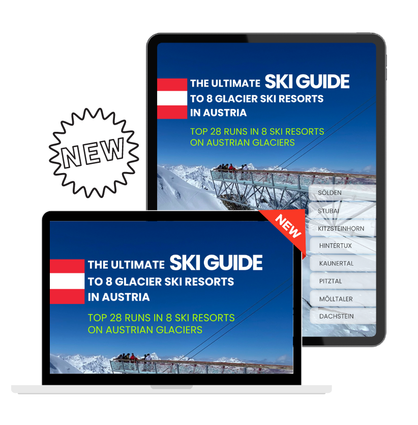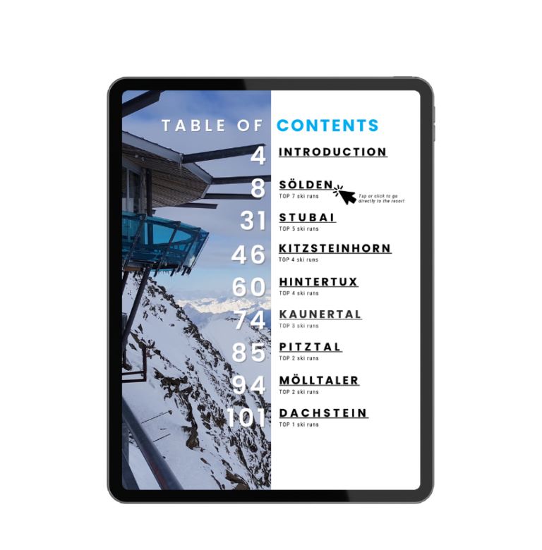 Don’t waste time searching for information online! This guide provides detailed descriptions of resorts, run recommendations, ski maps, and videos of selected runs in the 8 best glacier ski resorts in Austria.